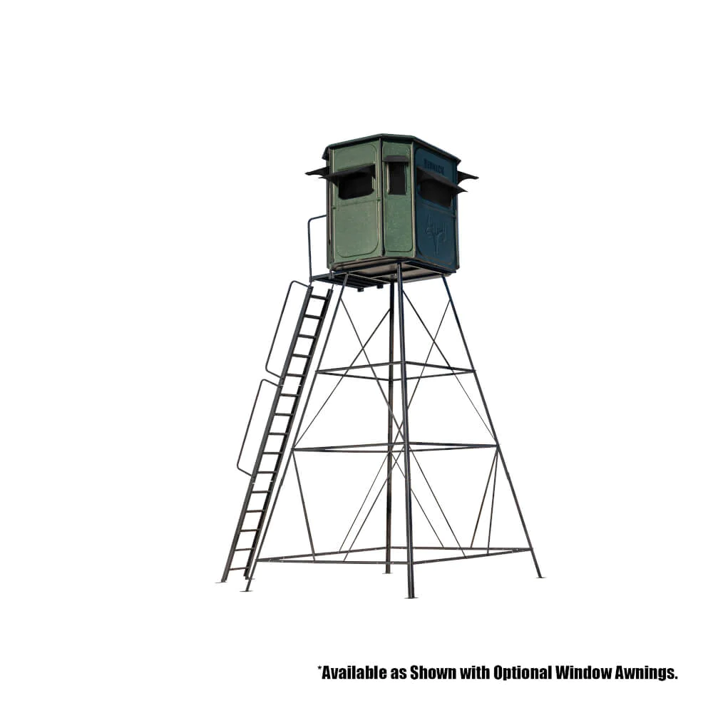 Made from long-lasting fiberglass with a durable gel-coat finish. The 2″ roof overhang and window drip edge help keep the rain off the windows, giving you a clear view of your hunting grounds. The interior of the blind comes with a closed-cell foam insulated ceiling, acoustical foam-covered walls, and a high-density foam pad underneath a marine-carpeted floor that provides superior sound control and insulation. A mounted gear console and shelves with gun holders help organize your blinds, and one Green LED Light is under the front. Large tinted, tempered automotive-glass windows with whisper-quiet window hinges provide a clear view. High-quality automotive window gaskets and door molding help keep your scent in, the blind dry, and the pests out. The fiberglass bottom prevents rotting and varmint damage.
